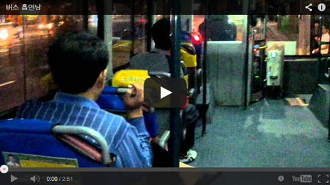 만취 상태의 남자가 흡연을 합니다...흡연하는 행동은 영상에 없지만 촬영 전에 흡연을 다 한상태것도 모자라서 한까치 마저 들고 있네요결국 기사 아저씨 까지 나오는 상황...촬영을 한 저는 맨처음 아저씨한테 하지말라고 말을 했습니다...말이 안통하니까 제가 돌았냐고 말하니까 돌았데요...결국 뒤에 남자가 무서웠는지 내리기 전에 불 붙이고 숨 한번 내뱉고 내리는데내리고 나서 담배 냄새가 버스에 쫙 퍼지네요.....