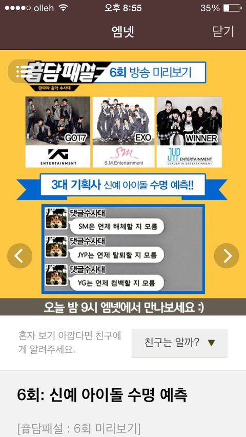 9시에 엠넷 음담패설에서 sm해체설 얘기 나온다고 플친 메시지 받음... 이런 민감한 날에 이런 얘길 하다니... 개념상실...