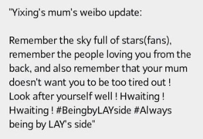 하늘에 꽉찬 별들을(팬들을) 기억해사람들이 뒤에서 너를사랑해준것을 기억해 그리고 또한 기억해두렴 엄마는 너가힘들어하는것을 원하지않는단다.너 자신을 스스로 돌봐 화이팅! 화이팅