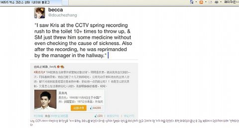 :나는 CCTV에서 10번이상 화장실로 가서 토하는 크리스를 보았다 SM은 심지어 질병의 원인을 확인하지 않고 그에게 몇 가지 약을 던졌다. 또한 레코딩이 끝난후 그는 복도에서 관리자에 의해 견책되었다(허물이나 잘못에 대해 질책을 받다. )