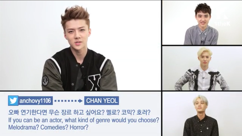 세훈 : 오빠는 연기한다면 무슨 장르 하고 싶어요? 멜로? 코믹? 호러?