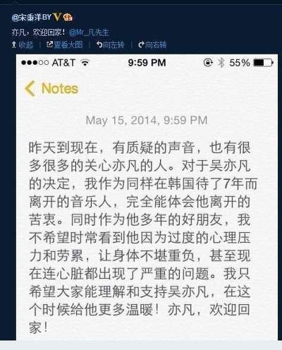 어제부터지금까지 질의하는 목소리가들리네요. 또 이판에게 많은관심을 주고있는사람들도있구요. 우이판의결정에대해 저는 칠년한국에머물다 지금은떠난음악인으로서 우이판의 고통을 잘 이해합니다. 동시에 그의 좋은친구로서 저는 그가 과로한 심리압박과 피로로 자주 아픈걸보고싶지않아요. 심지어 그는 지금 심장에 심각한문제가있기도합니다. 저는 그저 그의 입장을이해하고 지지해주길 바랍니다. 그에게따듯함을주세요. 이판 집에돌아온걸환영해