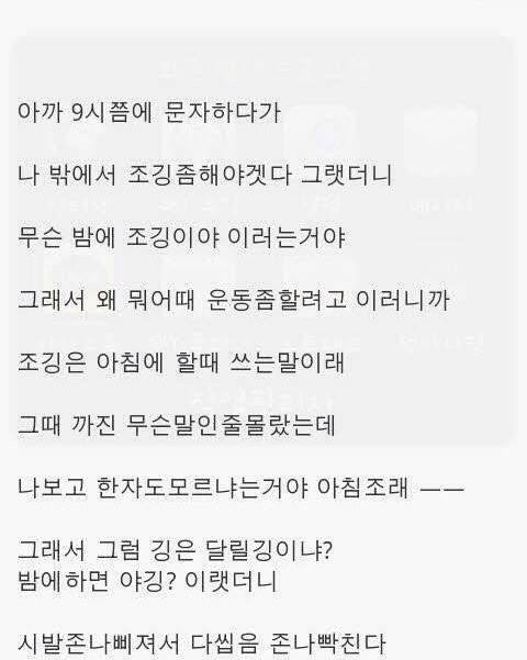 ↓(밑에분) 아침 조 ╋ 달릴 깅 --> 조깅이냐고 그럼 밤에 달리면 ...밤 야 ╋ 달릴 깅 --> 야깅이냐고 비꼰거에요 "조깅"이 한자어가 아닌 영어인데 아침조라고 하니까 그렇게 비꼰거임 어디가 이해가 안되실까요?;;;