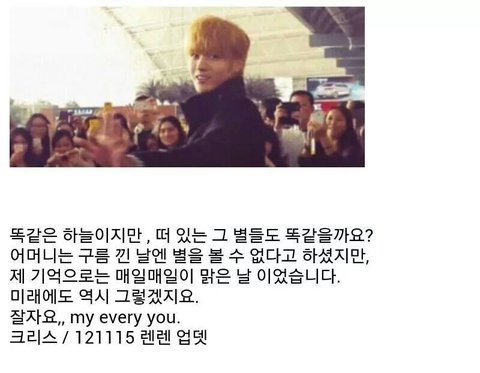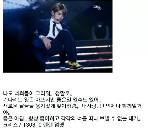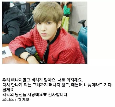 네가 했던 말들, 팬들을 생각해주는 마음들이 이제는 나를 눈물짓게 만드네..우리 나머지 멤버들에게,팬들에게 상처주고 떠나간만큼 성공해라 그러든말든 이제 신경쓰고싶지도 않다