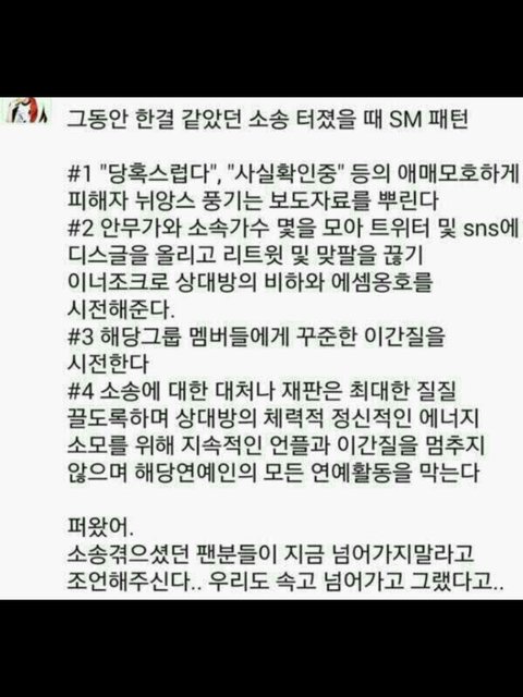 나는 구동방 시절부터 에스엠 빠수니 경력 10년인 사람이다. 그동안 계약해지 소송을 두 번 봐 왔고 스엠의 반응은 어쩜 매번 똑같을까ㅋㅋㅋㅋㅋㅋ 존;나 맨날 당황스럽대 당황봇이세요ㅋㅋㅋ 크리스가 회사에 요구사항을 말한번 하지않고 갑자기 소송을 걸었겠냐 말하다하다 소송까지 간 거겠지.