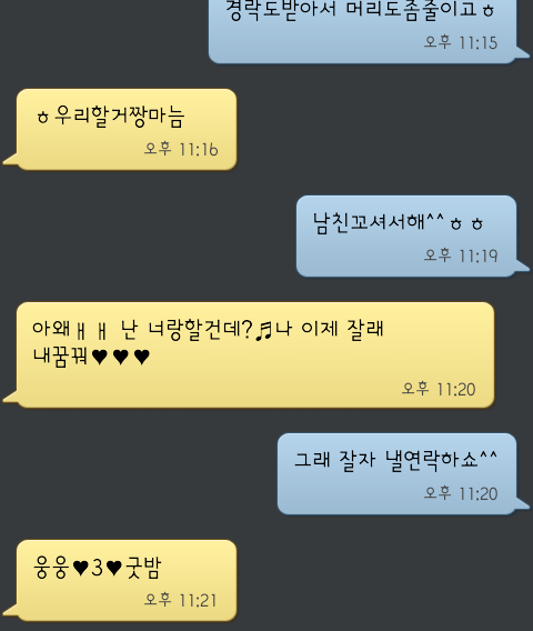 노란색이 여자인가요? 여자가 저정도 티내기 어려움. 여자가 엄청 좋아하는 구만. 여자들 남자베프라도 저런식으로 친한티를 내진 않아. 여자도 친구 이상의 감정을 느끼고 있는듯 하네요. 여자가 글쓴이 좋아하는것 같아요.