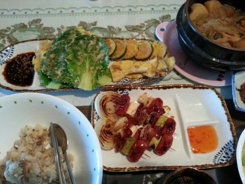 굴 된장찌개랑 호박전,봄동전,소시지파꼬치 등