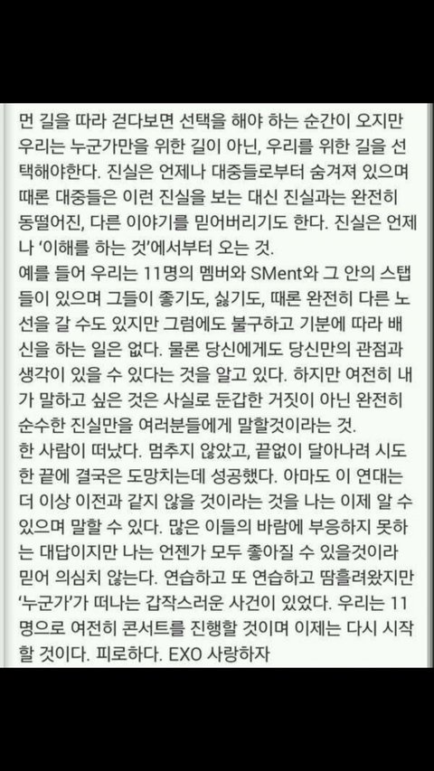 스엠이 이런일을 벌인 녀석에게 '알겠다알겠다 들어줄게~다시 엑소로들어와라' 이럴거같아?오히려 스엠은 '단독콘서트는 11명으로 할것'이라고 기사까지 냈어.