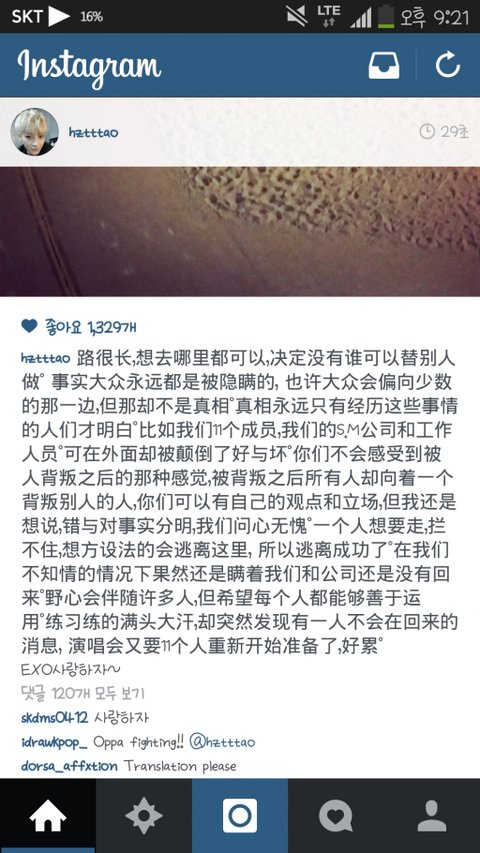 11명은 저 소식을 듣고 어땠을까? 어? 이런글 올렸다고 타오를 까내리는 정말 이해못할짓을하는 애들이있던데 타오가 나중에가서는 자신의 사진도 올렸지? 그것도 반은 메이크업을 안한채로. 그게 무슨의미겠어