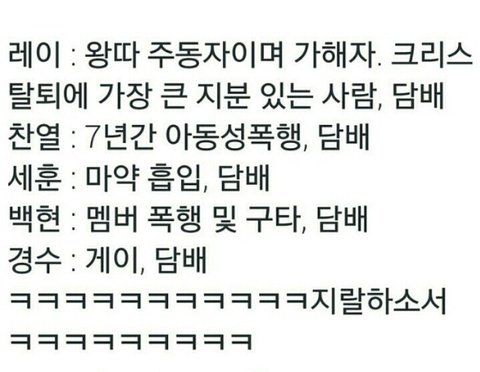 왜 죄없는 11명이 이상황에서 욕먹어야되고 멤버편안들어준다고 나쁜놈이 되야되지?상황의 주동자란놈은 웨이보에 글싸지르면서 중국소속사랑 계약하려는 꼬라지를 보이고있는데?크리스가 지금 쓰고있는 변호사가 저 중국소속사쪽인건 알고있어?저 소속사는 지금 스엠비리구해요~하는것도 알고있고?