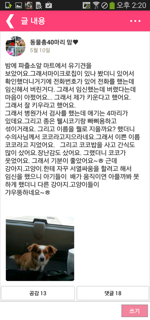 다행히 좋은 주인분을 만나서 새로운 삶을 살겠지만.임신한 반려견이 무슨 죄라고 버리기까지 하다니..애초에 중성화 수술을 하던지 참 이글 보면서 씁쓸함을 감출 수가 없네요...