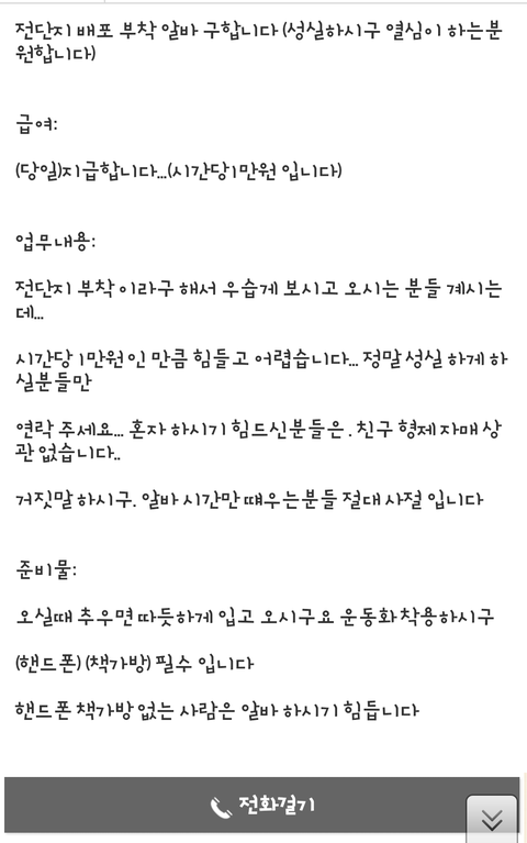 엄마생선도사야하고 어버이날선물도 아직도못삿고 또얼마전에 엄마가 사준신발이 좀비싸서 ㅠㅠ맘에걸려서 급하게 돈모을려고 친구세명이랑 전단지알바할려는데 낼 오전쯤어 ㅣ만나서 전화한뒤 가볼려는데 일단보기에 여기괜찬은거같애?