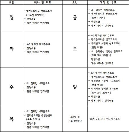 엠카운트 다운 투표(한 아이디당 금~월 투표 기간 동안 하루에 한 표씩 가능)