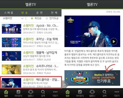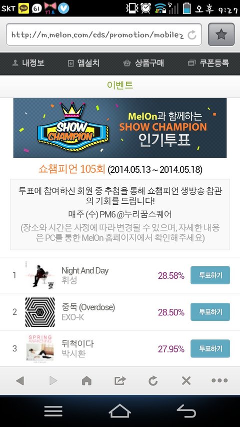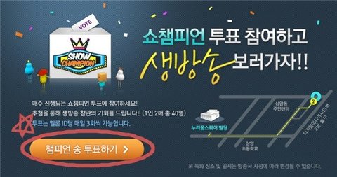 멜론 앱 깔기 -> 첫 화면에 멜론 tv클릭 -> 상단 바에 '방송' 누르기-> 프로그램 선택 -> 쇼챔피언 -> 쇼챔 동영상 아무거나 들어가기 -> 광고같이 배너로 쇼챔 투표가 뜸, 클릭 -> 엑소에게 투표(하루 세 표)