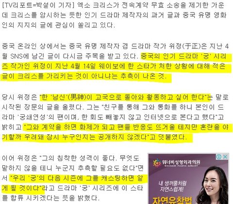 <크리스 중국드라마 '궁5' 출연 확정>