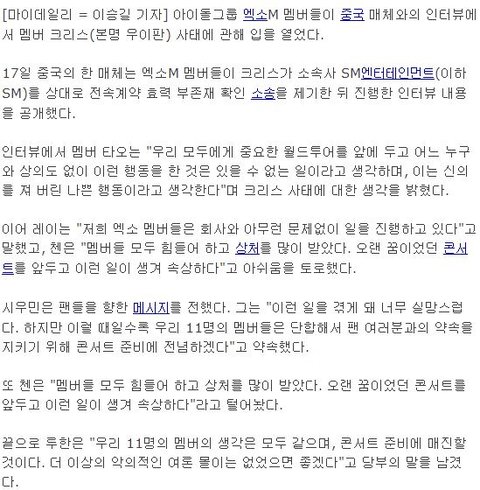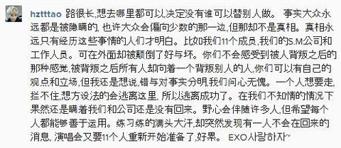 자기 하나로 인해 중국에서 억울한 루머와 욕을 먹고 있는 멤버들에 대한 해명은 단 한마디도 없음