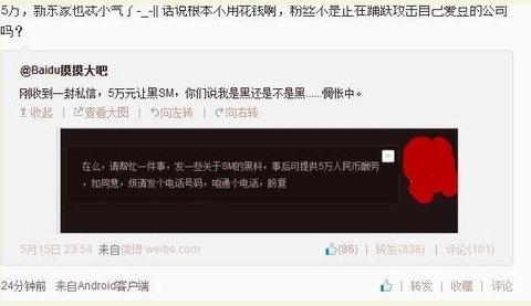 번역 : sm의 나쁜 자료들을 보내주면 5만위안(800만원)을 주겠다는 뜻.