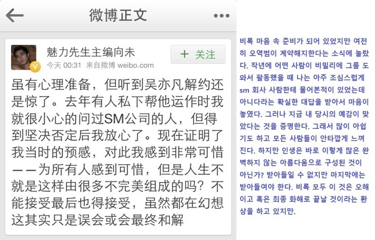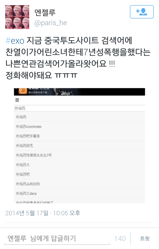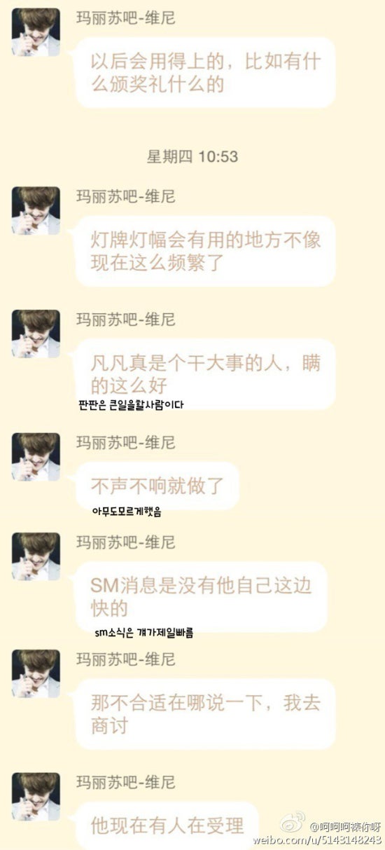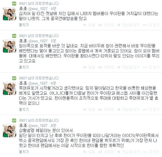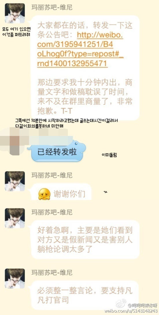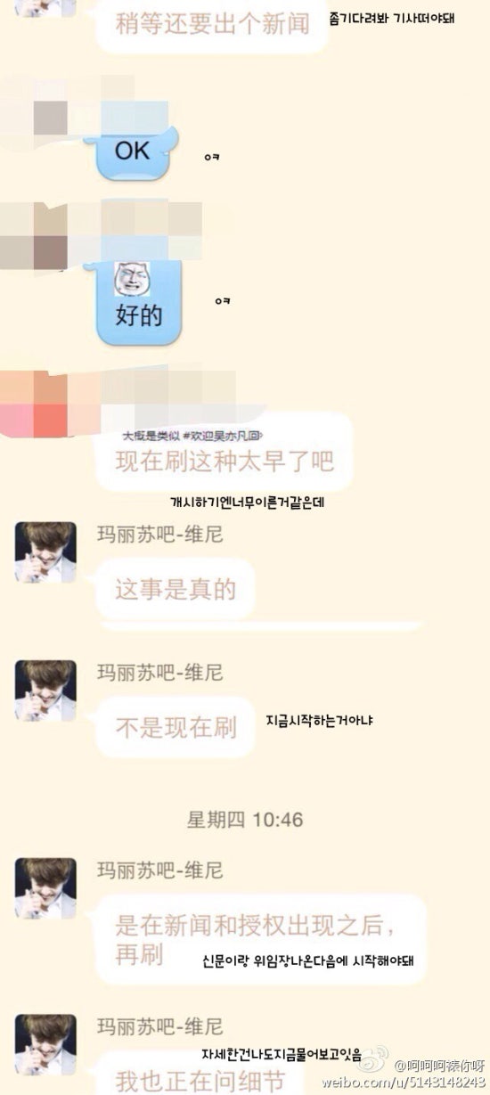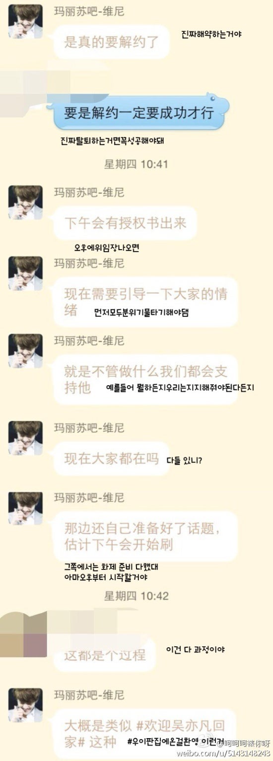 *****추측성 기사와 검색어 조작으로 멤버 깎아내리기가 시작되었는데 루한이 sm과 우이판 사이를 모함하고, 왕따당했다고 나오고 있습니다. 뒤에는 새 소속사와 홈마들이 있겠죠. 크리스 팬페이지 마스터들의 소송당일 오전 대화내용입니다.