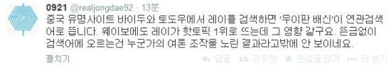 현재 루한과 레이가 함께, 우이판을 배신하고 왕따시켰다고 뜨고 있습니다. 왠만한 엑소 팬분들은 거의 아시겠죠 . 레이 정말 착하다는걸. 제가 또 우이판에게 화나는건 이 부분입니다. 자신은 잘있다고, 인스타에 올리고, 쇼핑 갈 시간은 있으면서 함께 해왔던 멤버들이 이런 루머에 휩쓸리고 있는데 해명 한 줄 남길 시간은 없는건가요? . 찬열