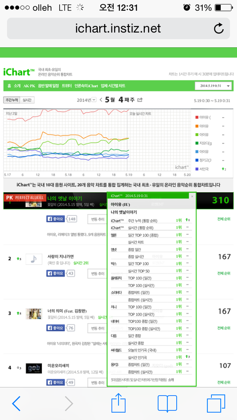 작년 10월부터 퍼펙트 올킬 한 노래가 분홍신, 금요일에 만나요, 렛잇고, 나의옛날이야기 4개 밖에 없단다.. 4곡중에 3곡이 아이유 노래구만..