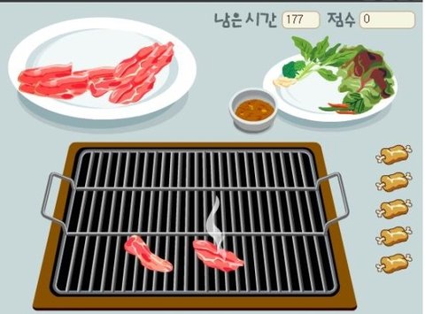 이거 고기굽는 게임ㅋㅋㅋㅋㅋㅋ내가 고기 안태우려고 얼마나 애썼었는뎈ㅋㅋㅋ결국은 다 탔지만^^..