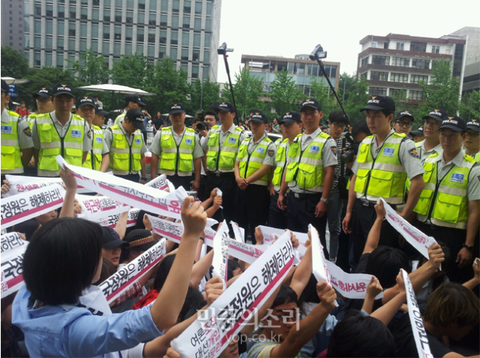 주한미군 철수와 군사훈련을 중단하라고 시위한다.