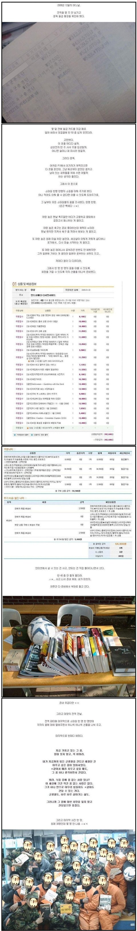 나 진짜 군대 전역할때 미련없이 후련하게 전역할줄 알았는데... 막상 전역날짜 다가오니까~ 가슴이 답답하고 뭔가 먹먹하고..내가 얘네 놔두고 어떻게 떠나나 싶더라. 진심 전역할때 눈물흘리는 고참 보고 왜저러나 싶었는데...나는 눈물콧물 다흘리고ㅋㅋ 솔직히 부모님한테는 미안한 얘기지만... 난 군대있을때 만큼은 내선임들이랑 내후임들이 더애뜻했어..왜그런지는 모르겠지만 그냥 밉다가도 안쓰럽기도 하다가도 고맙기도하고...에휴~이런것도 걍 아련한 추억이네...그러고 보니 저기 위에 글에 나와있는 사람도 나랑 비슷한 시기에 전역했나보네... 나도 2008년 12월에 했는데... 가끔은 그립다.