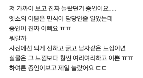 실물 후기 하나같이 종인이 너무 "예쁘다고" 하더라구 ㅠㅠㅠㅠㅠㅠㅠㅠ 왠지 이런 느낌 아닐까 싶어
