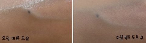 손등에 오일을 바른 뒤, 마블팩트를 발라봤는데 피부가 완전 보송보송 해지더라구요~