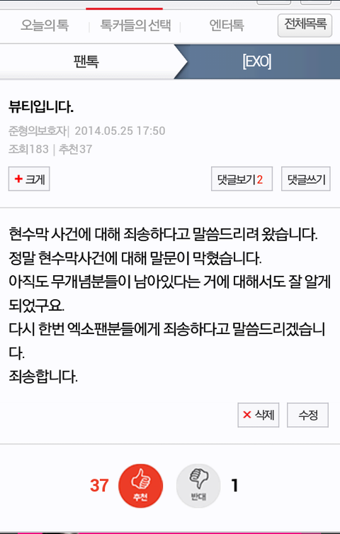 엑소톡에가서 사과 드렸구요.