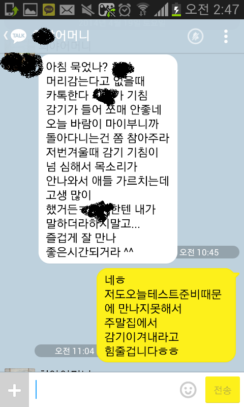 그러나 저는 어머니의 톡 내용을 생각하면서, 여자친구에게 오늘 하루는 쉬는게 좋지 않니?