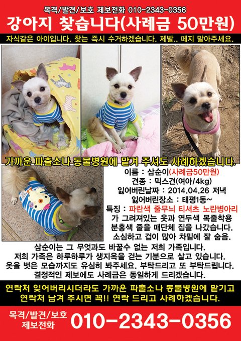 태평동에 사시는분들에게 집근처 한번이라도 구석에 저희 삼순이가 있는지 살펴봐달라고 이야기 좀 해주세요..
