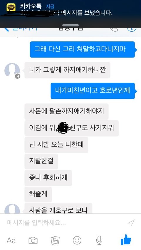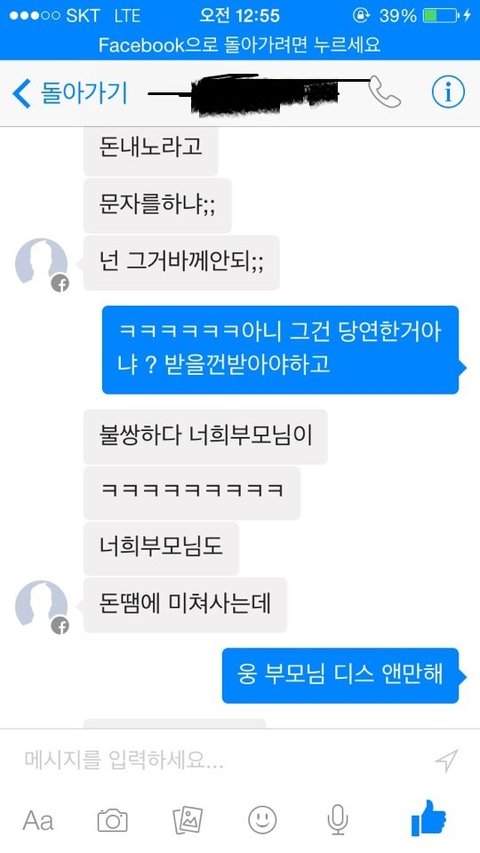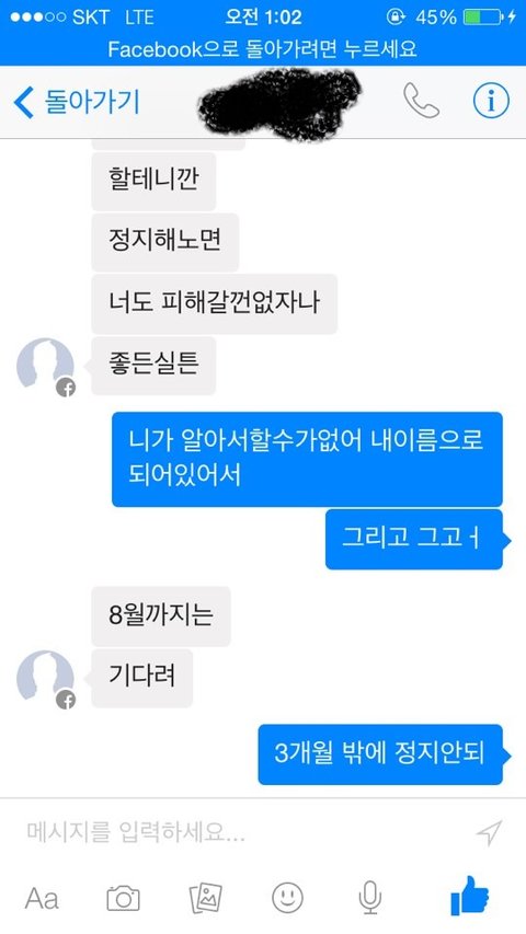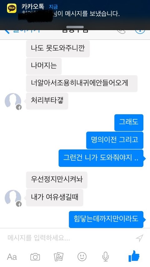 지금 걔네집에 방치되어있는것은 sk 인터넷 , TV, 그리고 그아이가 잃어버린 핸드폰,핸드폰비 이렇게있습니다. 네~ 해준 저도 진짜잘못이많죠 하지만 전부 어떠한 불이익이없게해주겠다는 말에 그리고 부모님이 신용불량자라 어떡해해야할지모르는참에 해주게됬습니다.사정이있어 동거하는중에 해주게되었는데 ..동거가 끝난후에도 인터넷 티비 핸드폰요금 절대내지않았어요 그래서 저한테 전화많이오길래 제가 한번내주고 그돈은 자기가주겠다고 했습니다. 그리고 걔네어머니도 저한테 준다고했고요 그리고 사귀고있는와중에 잦은폭언과 장난식으로의 손지검이 저희를 이렇게 만들어놨습니다. 최근에는 제가 돈을벌고있으니깐 햇살론에서 500만원대출 받아가지고 자기를꿔달라그래서 대출조건에 제가안된다고 해서 내뺏긴햇는데 이제 월급날이 돌아오니깐 이번엔 아버님앞으로 되어있는 마이너스통장을 매꿔야한다고 50만원빌려주란식으로 말하여 저도 생활이어렵고그런다고말했지만 막무가내로 자기가 봐줘서 30만원 빌려달라 꼼쳐놓은돈있으면 자기좀빌려달라 이런식이였어요 그와중에 그냥 제가 거절하기도 너무 짜증나서 그냥 연락을씹으면서 남자친구한테 이사정을 말했습니다. 근데 남자친구는 니가 알아서해라 자기말은 먹히지도않는다 이런식으로밖에 말을않하더라고요 서운한맘을참고 남자친구랑 만나기위해서 만날려고 만났는데ㅎㅎ 남친의 카톡을본순간 경악했죠