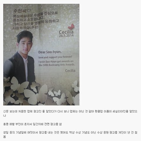 이거 진짜 조선일보인가 동아일보에있었는데ㅋㅋ 신문보다가 김수현 팬클럽이 보낸광고인줄 알았는데 ㅋㅋㅋㅋ 아니었네 팬클럽이름이 세실리아인줄 알았었는데