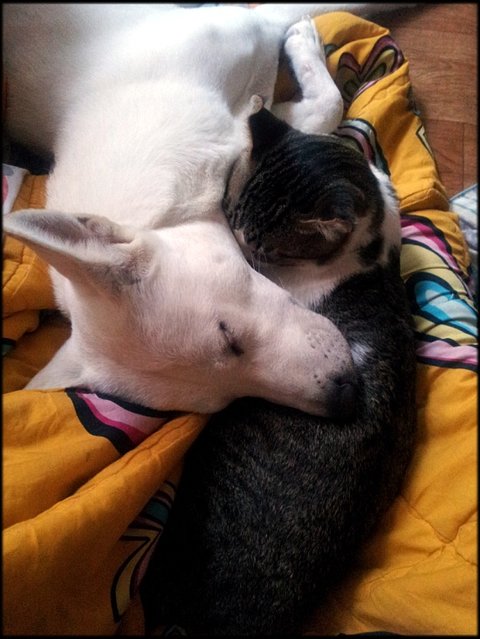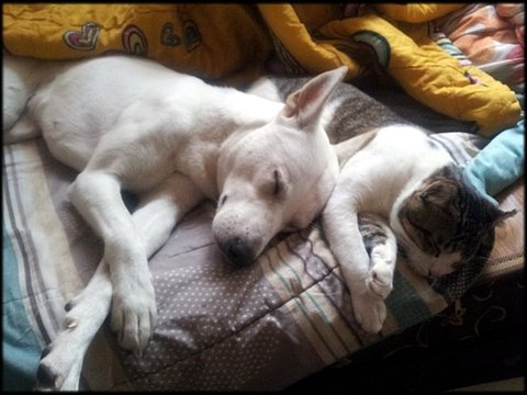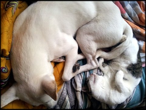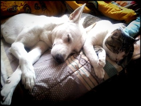오랜고심끝에 우리 백구 희망이와 길에서 데려온 아기고양이 사랑이와 함께 살면서