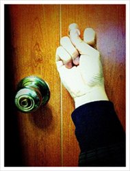 그는 침착하게 방의 문을 두드렸다.