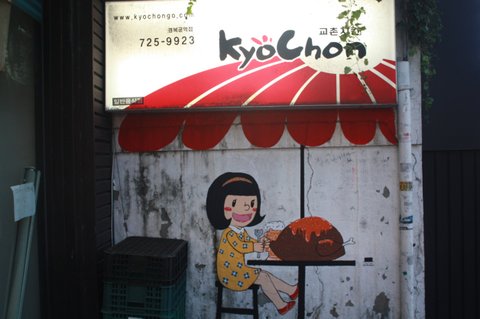 실제 교촌치킨 건물 더러워진 옆면을 활용하여
