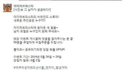 진짜 정답 맞춰야하는데..오늘까지 아이러브파스타 페이스북, 카카오스토리를 통해 새 모델을