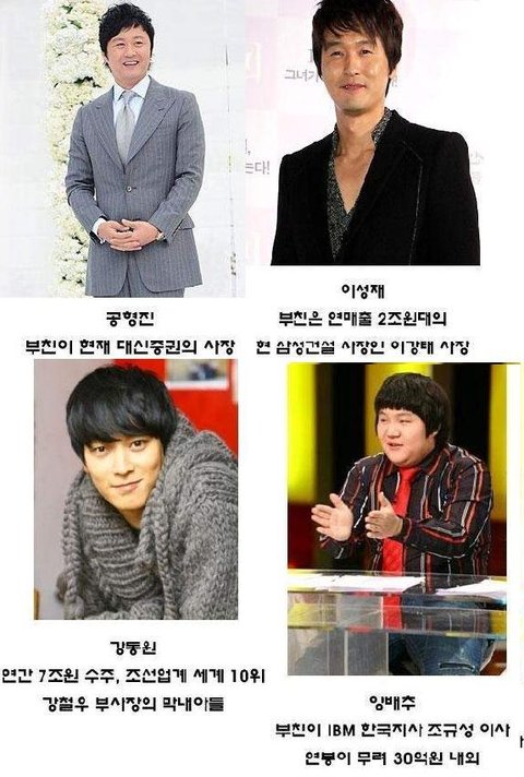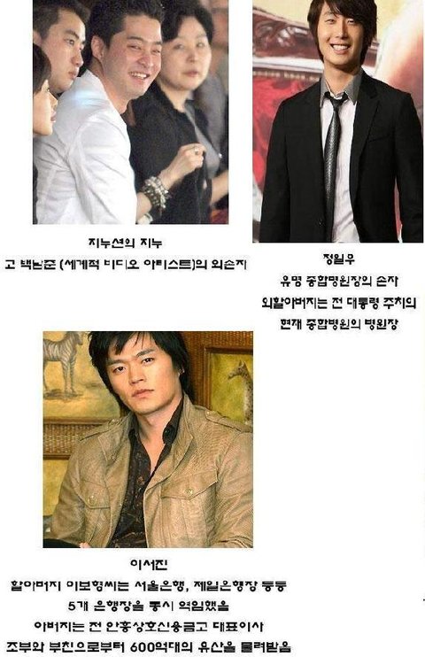 윤태영 (배우, 아버지 전 삼성전자 부회장 윤종용 당시 연봉 200억원, 탑 샐러리맨), 이종욱 (가수, 아버지 현대스위스저축은행 회장, 은행 자산 2조원), 이상엽 (배우, 할아버지 전 동국제강 회장 김정진), 유승찬 (가수, 아버지 동광그룹 회장, 재산 5천억원 대), 이필립 (배우, 아버지 STG그룹 회장, 미국 10대 유망 IT기업)