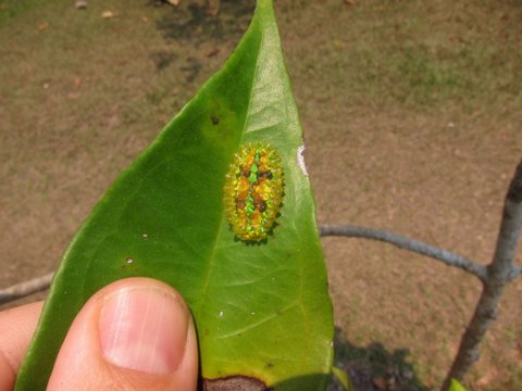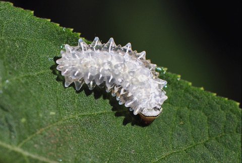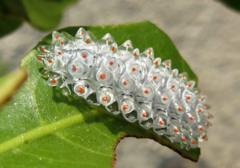 알알이 박아 넣은 듯한 인공적이고 화려한 생김새 덕분에 보석 애벌레라는 별명을 지니고 있는 이 곤충은 정식 학명 아크라가 코아라 불리는 나방의 애벌레.