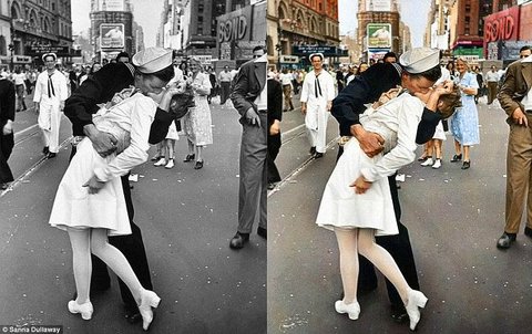 기쁨에 넘친 한 해군병사가 간호사에게 입맞춤을 하는 장면입니다.