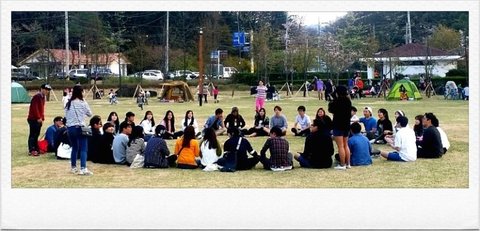 공지천에서 수건 돌리기를 하는 대학 새내기들의 모습