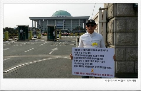진도에서 다시 배낭을 꾸려 여행을 멈췄던 춘천으로 향했다. 하지만 나는 다시 발길을 돌릴 수밖에 없었다. 온 나라가 슬픔에 잠겨 있고 애도를 하는 분위기에서 나 혼자 즐겁게 사람들을 만나는 여행을 할 자신이 없었기 때문이다. 다시 집으로 돌아온 나는 무언가 해야겠다는 생각을 했다. 안산에 마련된 세월호 분향소에 다녀온 후 준비한 피켓을 들고 국회로 향했다.