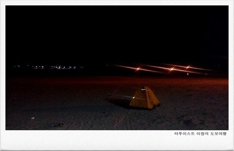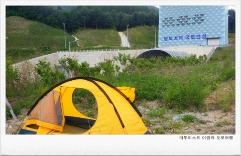 내 예상대로 밤은 어두워졌고 귀신이 세상에서 제일 무서운 나로선 배후령을 내려오는 시간이 정말 죽을 맛이었다. 뒤를 한 번도 돌아보지 않은 채 앞만 보며 부리나케 내려오니 큰 도로가 나왔고 도로 근처 평평한 곳 아무 데나 텐트를 쳤다. 시간은 밤 11시가 다 되어 있었다. 나는 옷을 두둑히 껴입고 텐트안 매트위에 몸을 뉘였다.내가 머문 자리