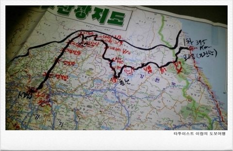 이동코스 : 오탄리 - 춘천 - 추곡리 - 양구 - 원통 - 용대삼거리 - 고성군(가진항)
