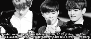 네, 지금 이 순간 2013년 11월 22일 금요일 한국시간으로 11시 43분 34초! 이 순간 즐기고, 잊지않고 항상 열심히 하는 엑소 되겠습니다.