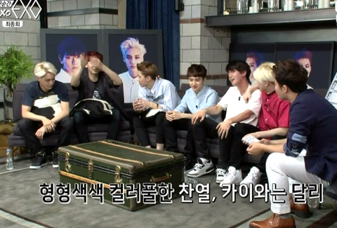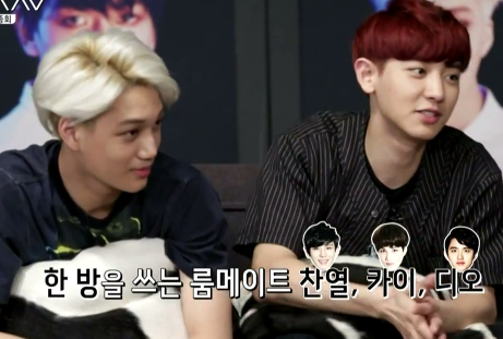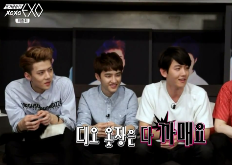 디오 집중탐구시간!! 블랙패션얘기가 나왔는데 차녀리가 얘기하길 카이 찬열 디오 이렇게 셋이 같은방 옷장을 쓴다고..