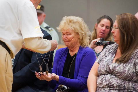 ▲시간이 지나, 드디어 아버지의 군번줄과 훈장을 받는 페기 에딩튼 스미스