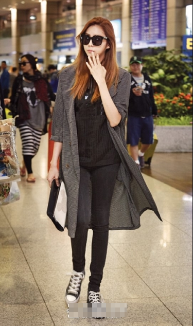 롱 자켓에 블랙 티셔츠를 입은 시크한 공항패션