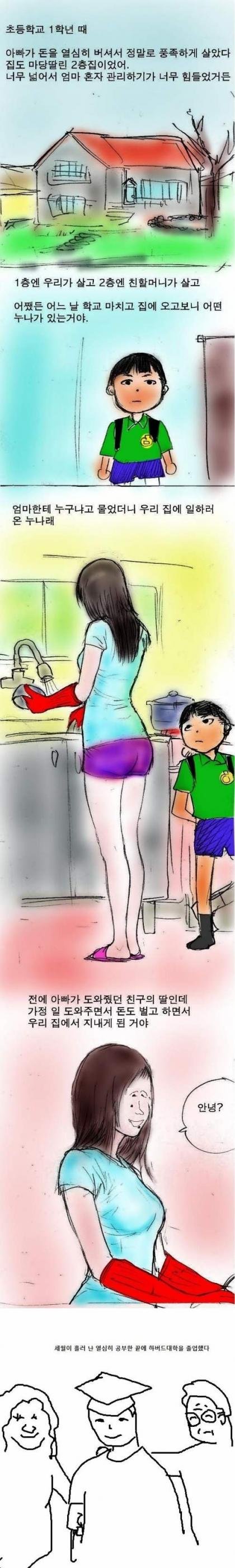 뭔데 내용이 그럼ㅋㅋㅋㅋ 난 그냥 가정부누나가 얼굴까지 이뻤으면 누나땜에 심쿵하고 혼자 그린라이트 껐다켰다 하면서 나이먹어도 공부집중안해서 하버드대못갔을텐데 얼굴이 다행히 못생겨서 공부에 집중할수있었다.그래서 누나고뭐고 하버드대감 이런걸로 해석했는데ㅜㅜ 원래 내용이 뭔데ㅋㅋ